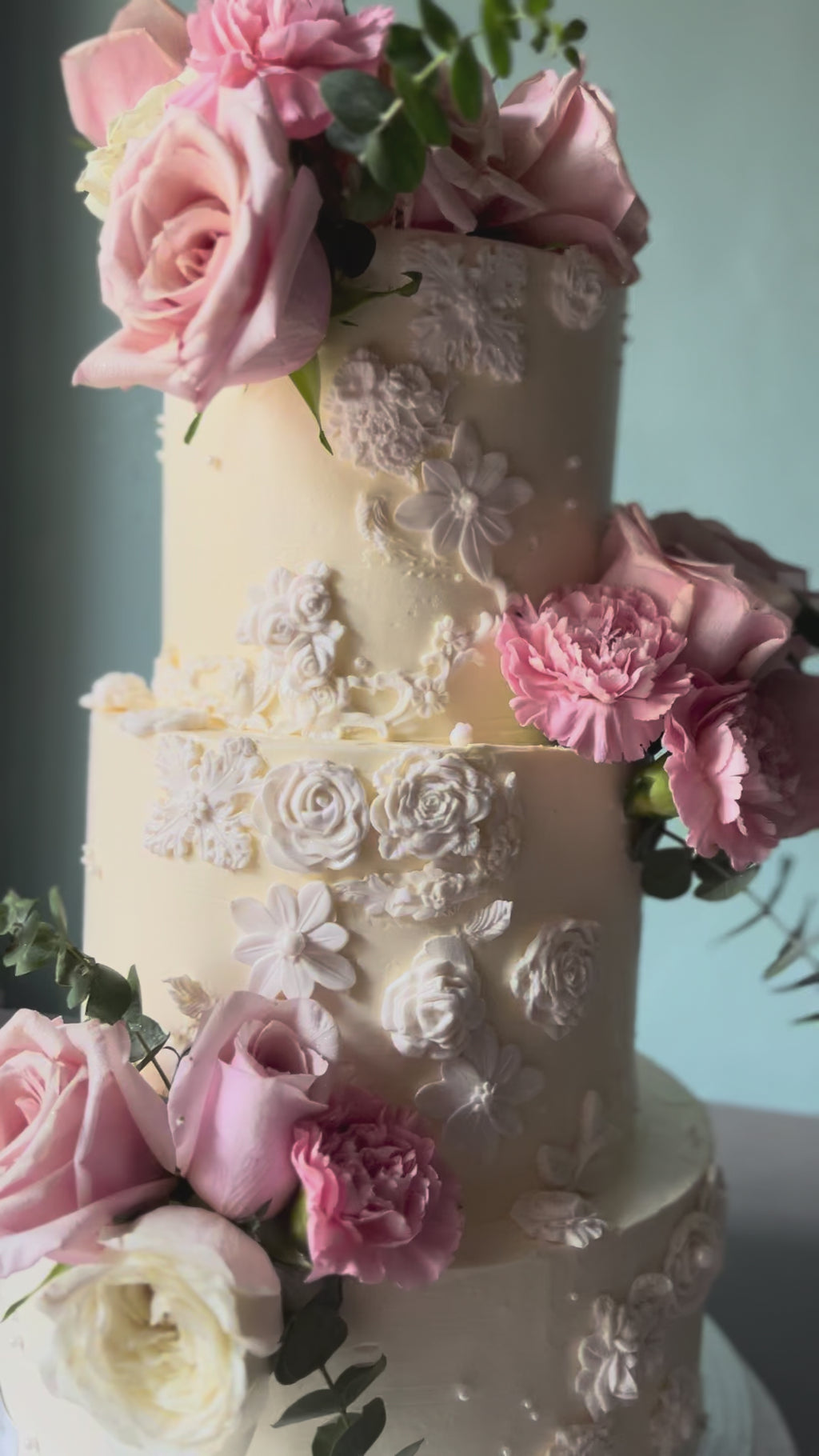 Fresh flowers on a buttercream-coated cake, floral reliefs.